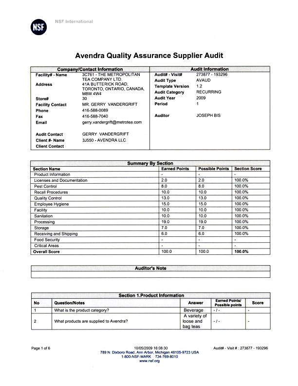 HACCP was developed for the NASA space program. Compliance is assured by an annual audit. Metropolitan Tea is HACCP compliant. HACCP Analyzes the food product cycle from raw ingredient stage to the finished product. Our Producer passed a rigorous 2-year process to obtain HACCP certification.