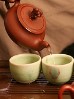 The tea pots are much smaller than typically found in the West, holding just 1-2 cups, or 8 ounces of liquid. Since the clay absorbs some of the tea's essence, different pots are used for different types of tea. The tea pots and cups sit on a special slatted bamboo box to drain and hold the excess liquid that is poured over the tea pots.